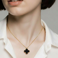 The necklace showcases a delicate black bloom centerpiece, highlighted with gold-lined detailing that adds sophistication and shine. Its lightweight design rests comfortably on the neck, making it perfect for both everyday wear and special occasions. The matching earrings mirror the same floral charm, completing the set with a cohesive, stylish finish.