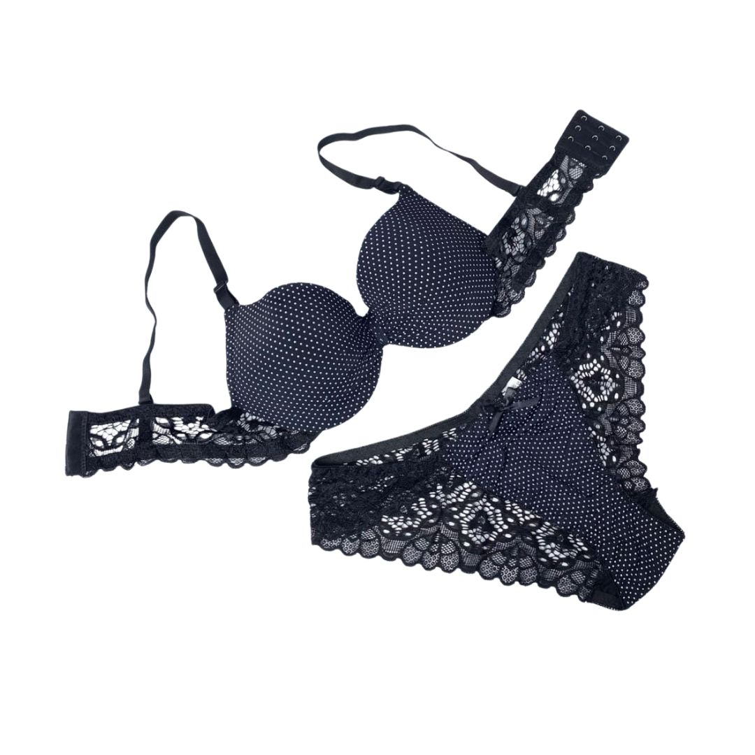 The Midnight Lace Whisper Lingerie Set by ZS WISHE blends subtle glamour with everyday ease, offering a beautifully balanced design that is both refined and effortlessly sensual. Styled in a jet-black shade with delicate micro-dot detailing, this set carries a soft shimmer that enhances its night-inspired elegance.
